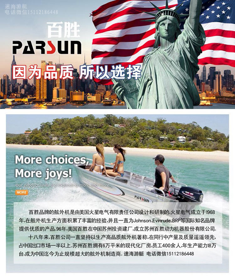 美國百勝品牌船外機具有性能穩定,馬力強勁,油耗低,排污少等特點,優異的防銹防腐系統更能增加船外機的耐久性,其耐用性能是目前船用發動機品牌中公認的。