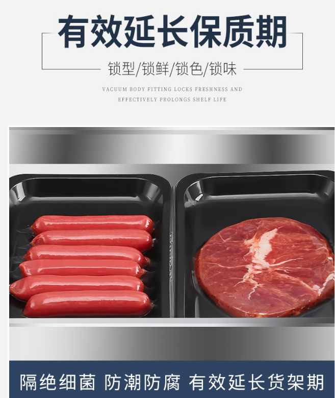 小型真空貼體包裝是一種新穎的商品包裝技術,在國際食品包裝行業深受青睞,真空貼體包裝主要由襯底托盤和塑料蓋膜組成